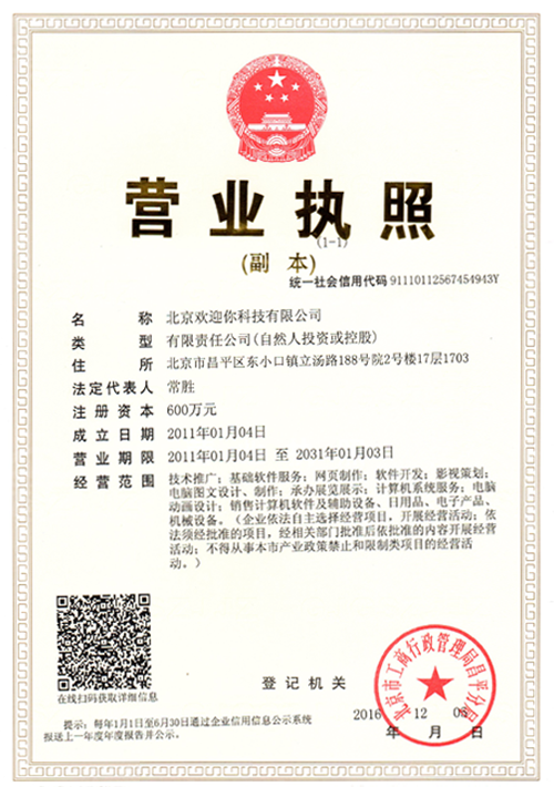 北京歡迎你科技有限公司獲得多項(xiàng)版權(quán)局"計(jì)算機(jī)軟件著作權(quán)登記證書",并已獲得“全國(guó)誠(chéng)信經(jīng)營(yíng)示范單位”、“全國(guó)質(zhì)量服務(wù)客戶滿意誠(chéng)信企業(yè)”和“全國(guó)重合同守信用品牌企業(yè)”等榮譽(yù)稱號(hào)。